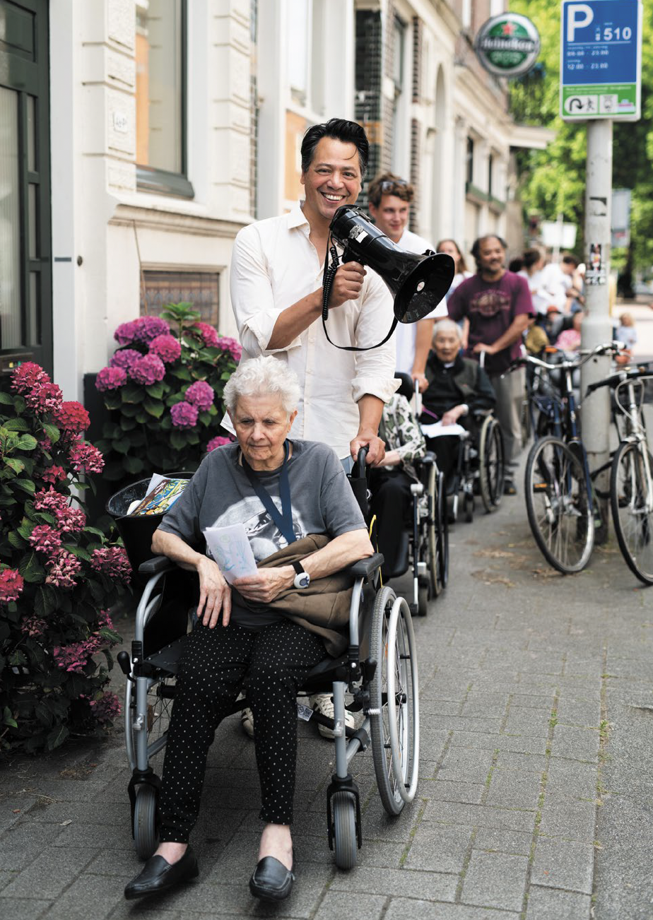De omgeving bekijken door een andere bril. Dat is het simpele doel achter de gelukswandelingen die Misja Immink organiseert. Elk jaar trekt hij er zo’n honderdvijftig keer op uit met zijn megafoon (of zijn roeptoeter, zoals hij het zelf noemt) in de hand en een rolstoelbrigade in colonne achter hem aan. Samen met een cohort vrijwilligers bezorgt hij bewoners van verzorgingstehuizen kriskras verspreid over Rotterdam een onvergetelijke middag. Zo’n gelukswandeling is als een warme golf van jeugdig enthousiasme die niemand onberoerd laat. (foto’s Marieke Odekerken)